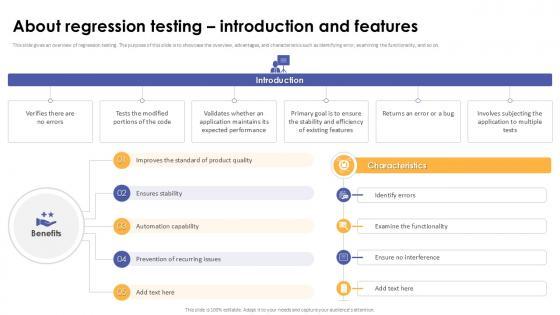 This slide gives an overview of regression testing. The purpose of this slide is to showcase the overview, advantages, and characteristics such as identifying error, examining the functionality, and so on. Boost your pitch with our creative About Regression Testing Introduction And Features Corrective Regression Testing Ppt Presentation Deliver an awe-inspiring pitch that will mesmerize everyone. Using these presentation templates you will surely catch everyones attention. You can browse the ppts collection on our website. We have researchers who are experts at creating the right content for the templates. So you do not have to invest time in any additional work. Just grab the template now and use them. This slide gives an overview of regression testing. The purpose of this slide is to showcase the overview, advantages, and characteristics such as identifying error, examining the functionality, and so on.