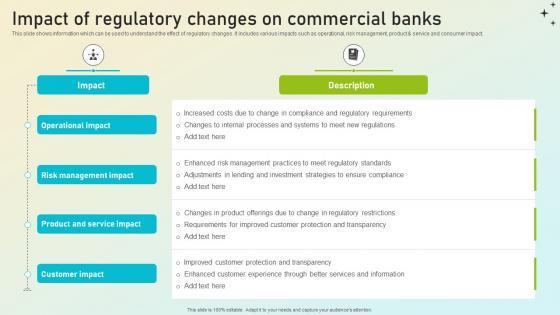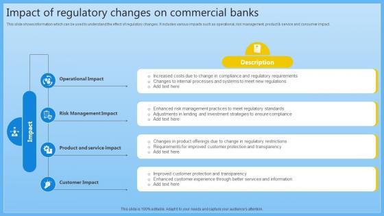 This slide shows information which can be used to understand the effect of regulatory changes. It includes various impacts such as operational, risk management, product and service and consumer impact. Slidegeeks has constructed Impact Of Regulatory Changes On Commercial Complete Guide On Managing Banking Fin SS V after conducting extensive research and examination. These presentation templates are constantly being generated and modified based on user preferences and critiques from editors. Here, you will find the most attractive templates for a range of purposes while taking into account ratings and remarks from users regarding the content. This is an excellent jumping-off point to explore our content and will give new users an insight into our top-notch PowerPoint Templates. This slide shows information which can be used to understand the effect of regulatory changes. It includes various impacts such as operational, risk management, product and service and consumer impact.