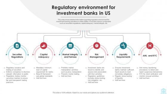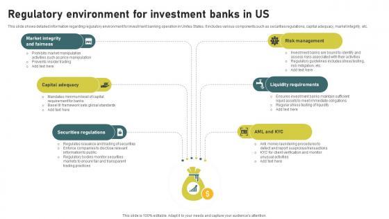 This slide shows detailed information regarding regulatory environment for investment banking operation in Unites States. It includes various components such as securities regulations, capital adequacy, market integrity, etc. Want to ace your presentation in front of a live audience Our Regulatory Environment For Investment Banks In Us Mastering Investment Banking Fin SS V can help you do that by engaging all the users towards you. Slidegeeks experts have put their efforts and expertise into creating these impeccable powerpoint presentations so that you can communicate your ideas clearly. Moreover, all the templates are customizable, and easy-to-edit and downloadable. Use these for both personal and commercial use. This slide shows detailed information regarding regulatory environment for investment banking operation in Unites States. It includes various components such as securities regulations, capital adequacy, market integrity, etc.