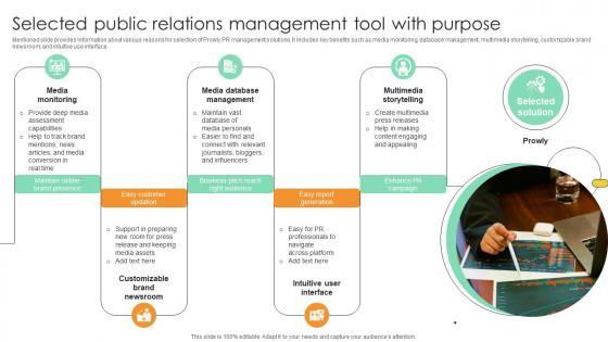 Mentioned slide provides information about various reasons for selection of Prowly PR management solutions. It includes key benefits such as media monitoring, database management, multimedia storytelling, customizable brand newsroom, and intuitive use interface.Take your projects to the next level with our ultimate collection of Selected Public Relations Management Tool With Comprehensive Guide For Marketing Technology. Slidegeeks has designed a range of layouts that are perfect for representing task or activity duration, keeping track of all your deadlines at a glance. Tailor these designs to your exact needs and give them a truly corporate look with your own brand colors they will make your projects stand out from the rest Mentioned slide provides information about various reasons for selection of Prowly PR management solutions. It includes key benefits such as media monitoring, database management, multimedia storytelling, customizable brand newsroom, and intuitive use interface.