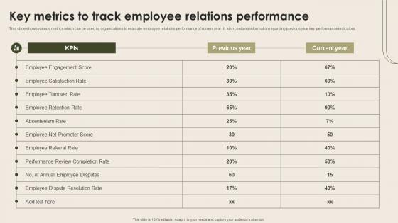 This slide shows various metrics which can be used by organizations to evaluate employee relations performance of current year. It also contains information regarding previous year key performance indicators. This modern and well-arranged Human Resource Industrial Relationship Key Metrics To Track Employee Relations Performance provides lots of creative possibilities. It is very simple to customize and edit with the Powerpoint Software. Just drag and drop your pictures into the shapes. All facets of this template can be edited with Powerpoint, no extra software is necessary. Add your own material, put your images in the places assigned for them, adjust the colors, and then you can show your slides to the world, with an animated slide included. This slide shows various metrics which can be used by organizations to evaluate employee relations performance of current year. It also contains information regarding previous year key performance indicators.
