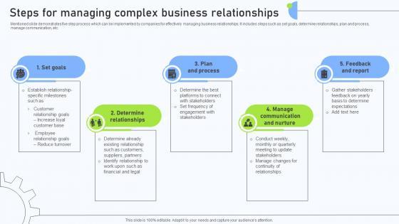 Mentioned slide demonstrates five step process which can be implemented by companies for effectively managing business relationships. It includes steps such as set goals, determine relationships, plan and process, manage communication, etc. Whether you have daily or monthly meetings, a brilliant presentation is necessary. Steps For Managing Complex Business Relationships Slides PDF can be your best option for delivering a presentation. Represent everything in detail using Steps For Managing Complex Business Relationships Slides PDF and make yourself stand out in meetings. The template is versatile and follows a structure that will cater to your requirements. All the templates prepared by Slidegeeks are easy to download and edit. Our research experts have taken care of the corporate themes as well. So, give it a try and see the results.