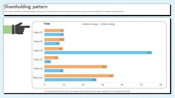 This slide presents the shareholding pattern of investors. It includes total investors and their shares in the company before and after the completion of funding round. This Shareholding Pattern Customer Relationship Management Platform Pitch Deck is perfect for any presentation, be it in front of clients or colleagues. It is a versatile and stylish solution for organizing your meetings. The Shareholding Pattern Customer Relationship Management Platform Pitch Deck features a modern design for your presentation meetings. The adjustable and customizable slides provide unlimited possibilities for acing up your presentation. Slidegeeks has done all the homework before launching the product for you. So, do not wait, grab the presentation templates today This slide presents the shareholding pattern of investors. It includes total investors and their shares in the company before and after the completion of funding round.