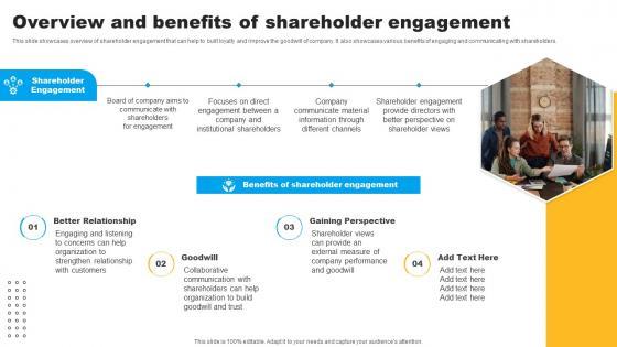 This slide showcases overview of shareholder engagement that can help to built loyalty and improve the goodwill of company. It also showcases various benefits of engaging and communicating with shareholders. If you are looking for a format to display your unique thoughts, then the professionally designed Strategies To Maintain Effective Relationships Overview And Benefits Of Shareholder Infographics Pdf is the one for you. You can use it as a Google Slides template or a PowerPoint template. Incorporate impressive visuals, symbols, images, and other charts. Modify or reorganize the text boxes as you desire. Experiment with shade schemes and font pairings. Alter, share or cooperate with other people on your work. Download Strategies To Maintain Effective Relationships Overview And Benefits Of Shareholder Infographics Pdf and find out how to give a successful presentation. Present a perfect display to your team and make your presentation unforgettable. This slide showcases overview of shareholder engagement that can help to built loyalty and improve the goodwill of company. It also showcases various benefits of engaging and communicating with shareholders.