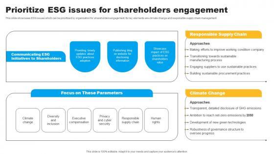 This slide showcases ESG issues which can be prioritized by organization for shareholders engagement. Its key elements are climate change and responsible supply chain management. Welcome to our selection of the Strategies To Maintain Effective Relationships Prioritize Esg Issues For Shareholders Mockup Pdf. These are designed to help you showcase your creativity and bring your sphere to life. Planning and Innovation are essential for any business that is just starting out. This collection contains the designs that you need for your everyday presentations. All of our PowerPoints are 100 percent editable, so you can customize them to suit your needs. This multi-purpose template can be used in various situations. Grab these presentation templates today. This slide showcases ESG issues which can be prioritized by organization for shareholders engagement. Its key elements are climate change and responsible supply chain management.