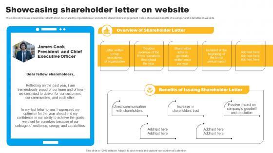 This slide showcases shareholder letter that can be shared by organization on website for shareholders engagement. It also showcases benefits of issuing shareholder letter on website. Presenting this PowerPoint presentation, titled Strategies To Maintain Effective Relationships Showcasing Shareholder Letter On Website Brochure Pdf, with topics curated by our researchers after extensive research. This editable presentation is available for immediate download and provides attractive features when used. Download now and captivate your audience. Presenting this Strategies To Maintain Effective Relationships Showcasing Shareholder Letter On Website Brochure Pdf. Our researchers have carefully researched and created these slides with all aspects taken into consideration. This is a completely customizable Strategies To Maintain Effective Relationships Showcasing Shareholder Letter On Website Brochure Pdf that is available for immediate downloading. Download now and make an impact on your audience. Highlight the attractive features available with our PPTs. This slide showcases shareholder letter that can be shared by organization on website for shareholders engagement. It also showcases benefits of issuing shareholder letter on website.