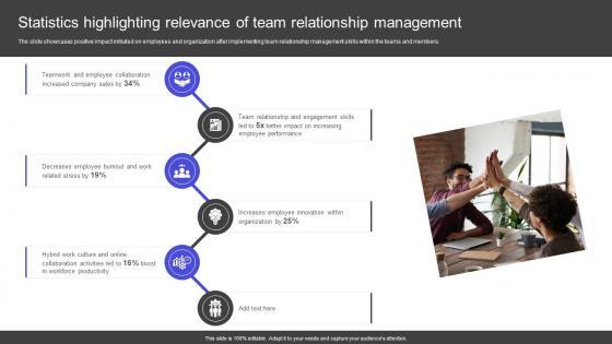 The slide showcases positive impact initiated on employees and organization after implementing team relationship management skills within the teams and members. Slidegeeks is here to make your presentations a breeze with Strategies To Build Meaningful Statistics Highlighting Relevance Of Team Relationship Pictures Pdf With our easy-to-use and customizable templates, you can focus on delivering your ideas rather than worrying about formatting. With a variety of designs to choose from, you are sure to find one that suits your needs. And with animations and unique photos, illustrations, and fonts, you can make your presentation pop. So whether you are giving a sales pitch or presenting to the board, make sure to check out Slidegeeks first The slide showcases positive impact initiated on employees and organization after implementing team relationship management skills within the teams and members.