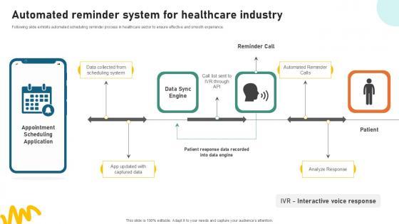 Following slide exhibits automated scheduling reminder process in healthcare sector to ensure effective and smooth experience. Create an editable Automated Reminder System Sample Pitch Deck For Video Ppt Slide that communicates your idea and engages your audience. Whether you are presenting a business or an educational presentation, pre-designed presentation templates help save time. Automated Reminder System Sample Pitch Deck For Video Ppt Slide is highly customizable and very easy to edit, covering many different styles from creative to business presentations. Slidegeeks has creative team members who have crafted amazing templates. So, go and get them without any delay. Following slide exhibits automated scheduling reminder process in healthcare sector to ensure effective and smooth experience.