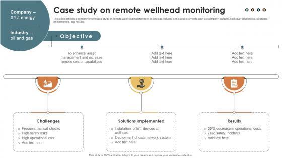 This slide exhibits a comprehensive case study on remote wellhead monitoring in oil and gas industry. It includes elements such as company, industry, objective, challenges, solutions implemented, and results. Want to ace your presentation in front of a live audience Our IoT Solutions For Oil And Case Study On Remote Wellhead Monitoring IoT SS V can help you do that by engaging all the users towards you. Slidegeeks experts have put their efforts and expertise into creating these impeccable powerpoint presentations so that you can communicate your ideas clearly. Moreover, all the templates are customizable, and easy-to-edit and downloadable. Use these for both personal and commercial use. This slide exhibits a comprehensive case study on remote wellhead monitoring in oil and gas industry. It includes elements such as company, industry, objective, challenges, solutions implemented, and results.