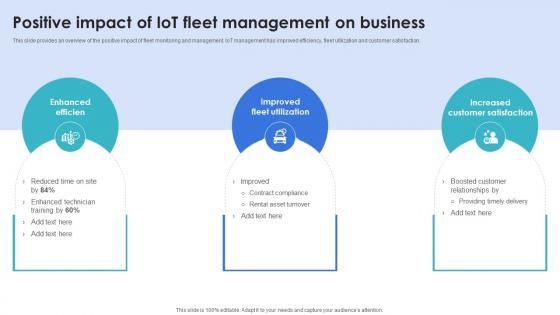 This slide provides an overview of the positive impact of fleet monitoring and management. IoT management has improved efficiency, fleet utilization and customer satisfaction. Formulating a presentation can take up a lot of effort and time, so the content and message should always be the primary focus. The visuals of the PowerPoint can enhance the presenters message, so our Optimization Of IoT Remote Monitoring Positive Impact Of IoT Fleet Management On Business IoT SS V was created to help save time. Instead of worrying about the design, the presenter can concentrate on the message while our designers work on creating the ideal templates for whatever situation is needed. Slidegeeks has experts for everything from amazing designs to valuable content, we have put everything into Optimization Of IoT Remote Monitoring Positive Impact Of IoT Fleet Management On Business IoT SS V. This slide provides an overview of the positive impact of fleet monitoring and management. IoT management has improved efficiency, fleet utilization and customer satisfaction.