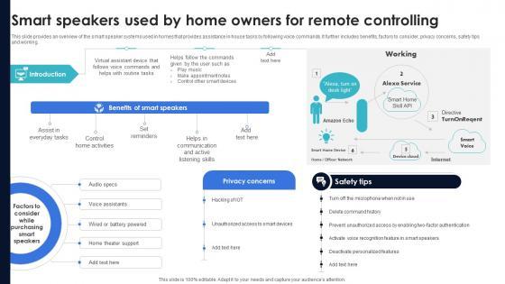 This slide provides an overview of the smart speaker systems used in homes that provides assistance in house tasks by following voice commands. It further includes benefits, factors to consider, privacy concerns, safety tips and working. Create an editable Optimization Of IoT Remote Monitoring Smart Speakers Used By Home Owners For Remote Controlling IoT SS V that communicates your idea and engages your audience. Whether you are presenting a business or an educational presentation, pre-designed presentation templates help save time. Optimization Of IoT Remote Monitoring Smart Speakers Used By Home Owners For Remote Controlling IoT SS V is highly customizable and very easy to edit, covering many different styles from creative to business presentations. Slidegeeks has creative team members who have crafted amazing templates. So, go and get them without any delay. This slide provides an overview of the smart speaker systems used in homes that provides assistance in house tasks by following voice commands. It further includes benefits, factors to consider, privacy concerns, safety tips and working.