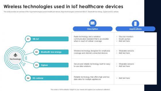 This slide provides an overview of the major technologies used in healthcare devices. Major technologies covered are NB-IoT, Bluetooth low energy, Zigbee and 5G cellular. If you are looking for a format to display your unique thoughts, then the professionally designed Optimization Of IoT Remote Monitoring Wireless Technologies Used In IoT Healthcare Devices IoT SS V is the one for you. You can use it as a Google Slides template or a PowerPoint template. Incorporate impressive visuals, symbols, images, and other charts. Modify or reorganize the text boxes as you desire. Experiment with shade schemes and font pairings. Alter, share or cooperate with other people on your work. Download Optimization Of IoT Remote Monitoring Wireless Technologies Used In IoT Healthcare Devices IoT SS V and find out how to give a successful presentation. Present a perfect display to your team and make your presentation unforgettable. This slide provides an overview of the major technologies used in healthcare devices. Major technologies covered are NB-IoT, Bluetooth low energy, Zigbee and 5G cellular.