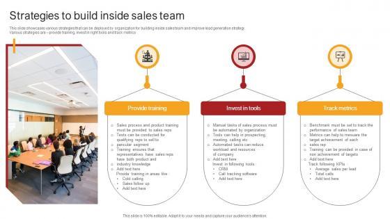 This slide showcases various strategies that can be deployed by organization for building inside sales team and improve lead generation strategy. Various strategies are provide training, invest in right tools and track metrics. Get a simple yet stunning designed Remote Sales Plan For Strategies To Build Inside Sales Team Strategy SS V. It is the best one to establish the tone in your meetings. It is an excellent way to make your presentations highly effective. So, download this PPT today from Slidegeeks and see the positive impacts. Our easy-to-edit Remote Sales Plan For Strategies To Build Inside Sales Team Strategy SS V can be your go-to option for all upcoming conferences and meetings. So, what are you waiting for Grab this template today. This slide showcases various strategies that can be deployed by organization for building inside sales team and improve lead generation strategy. Various strategies are provide training, invest in right tools and track metrics.