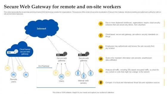 This slide represents the on-premise and cloud based SWG technology solution for organizations. The purpose of this slide is to provide visualization of Secure Web Gateway structure enabling encrypted web surfing for both on-site and remote employees. There are so many reasons you need a Web Access Control Solution Secure Web Gateway For Remote And Onsite Workers. The first reason is you can not spend time making everything from scratch, Thus, Slidegeeks has made presentation templates for you too. You can easily download these templates from our website easily. This slide represents the on-premise and cloud based SWG technology solution for organizations. The purpose of this slide is to provide visualization of Secure Web Gateway structure enabling encrypted web surfing for both on-site and remote employees.