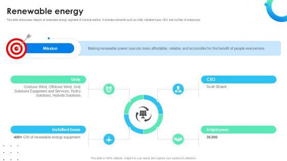 This slide showcases mission of renewable energy segment of General electric. It includes elements such as Units, installed base, CEO and number of employees. Boost your pitch with our creative Renewable Energy Global Energy Company Profile PPT Presentation CP SS V. Deliver an awe-inspiring pitch that will mesmerize everyone. Using these presentation templates you will surely catch everyones attention. You can browse the ppts collection on our website. We have researchers who are experts at creating the right content for the templates. So you do not have to invest time in any additional work. Just grab the template now and use them. This slide showcases mission of renewable energy segment of General electric. It includes elements such as Units, installed base, CEO and number of employees.