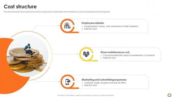 This slide showcases various expenses incurred by company such as staff salaries, store maintenance cost, and marketing and promotional expenses.Create an editable Cost Structure Renovation Supplies Business Model BMC SS V that communicates your idea and engages your audience. Whether you are presenting a business or an educational presentation, pre-designed presentation templates help save time. Cost Structure Renovation Supplies Business Model BMC SS V is highly customizable and very easy to edit, covering many different styles from creative to business presentations. Slidegeeks has creative team members who have crafted amazing templates. So, go and get them without any delay. This slide showcases various expenses incurred by company such as staff salaries, store maintenance cost, and marketing and promotional expenses.