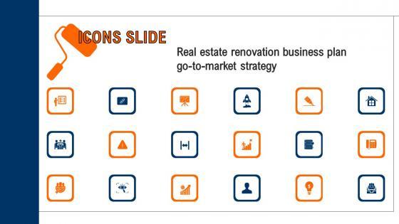 Presenting our innovatively structured Icons Slide Real Estate Renovation Business Plan Go To Market Strategy Infographics Pdf set of slides. The slides contain a hundred percent editable icons. You can replace these icons without any inconvenience. Therefore, pick this set of slides and create a striking presentation. Our Icons Slide Real Estate Renovation Business Plan Go To Market Strategy Infographics Pdf are topically designed to provide an attractive backdrop to any subject. Use them to look like a presentation pro.