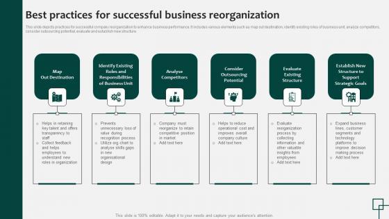 This slide depicts practices for successful company reorganization to enhance business performance. It includes various elements such as map out destination, identify existing roles of business unit, analyze competitors, consider outsourcing potential, evaluate and establish new structure. Showcasing this set of slides titled Best Practices For Successful Business Reorganization Themes Pdf The topics addressed in these templates are Identify Existing, Analyse Competitors, Consider Outsourcing All the content presented in this PPT design is completely editable. Download it and make adjustments in color, background, font etc. as per your unique business setting. This slide depicts practices for successful company reorganization to enhance business performance. It includes various elements such as map out destination, identify existing roles of business unit, analyze competitors, consider outsourcing potential, evaluate and establish new structure.