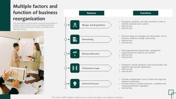 This slide depicts reasons behind company reorganization. It includes various motives such as downsizing, business direction, performance gaps, mergers, acquisitions and external pressure. Pitch your topic with ease and precision using this Multiple Factors And Function Of Business Reorganization Guidelines Pdf This layout presents information on Merger And Acquisitions, Downsizing, Business Direction It is also available for immediate download and adjustment. So, changes can be made in the color, design, graphics or any other component to create a unique layout. This slide depicts reasons behind company reorganization. It includes various motives such as downsizing, business direction, performance gaps, mergers, acquisitions and external pressure.