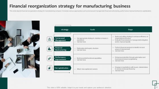 This slide depicts financial reorganization strategy for manufacturing company. It includes various approaches such as turnaround management, financial restructuring, performance improvement and re capitalization. Showcasing this set of slides titled Financial Reorganization Strategy For Manufacturing Business Professional Pdf The topics addressed in these templates are Turnaround Management, Financial Restructuring All the content presented in this PPT design is completely editable. Download it and make adjustments in color, background, font etc. as per your unique business setting. This slide depicts financial reorganization strategy for manufacturing company. It includes various approaches such as turnaround management, financial restructuring, performance improvement and re capitalization.