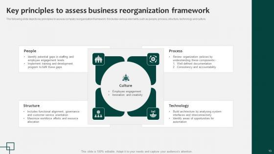 The following slide depicts key principles to assess company reorganization framework. It includes various elements such as people, process, structure, technology and culture. Showcasing this set of slides titled Key Principles To Assess Business Reorganization Framework Diagrams Pdf The topics addressed in these templates are Structure, Process, Technology, People All the content presented in this PPT design is completely editable. Download it and make adjustments in color, background, font etc. as per your unique business setting. The following slide depicts key principles to assess company reorganization framework. It includes various elements such as people, process, structure, technology and culture.