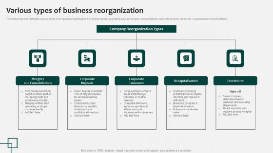 The following slide highlights various types of company reorganization. It includes various segments such as mergers, consolidations, corporate buyouts, takeovers, recapitalization and divestiture. Pitch your topic with ease and precision using this Various Types Of Business Reorganization Inspiration Pdf This layout presents information on Corporate Buyouts, Corporate Takeovers, Recapitalisation It is also available for immediate download and adjustment. So, changes can be made in the color, design, graphics or any other component to create a unique layout. The following slide highlights various types of company reorganization. It includes various segments such as mergers, consolidations, corporate buyouts, takeovers, recapitalization and divestiture.