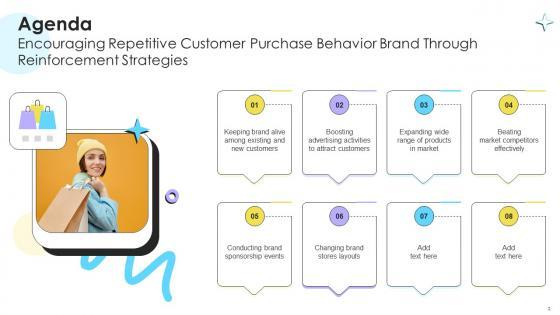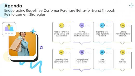 Find a pre-designed and impeccable Agenda Encouraging Repetitive Customer Purchase Behavior Brand Through Reinforcement Strategies. The templates can ace your presentation without additional effort. You can download these easy-to-edit presentation templates to make your presentation stand out from others. So, what are you waiting for Download the template from Slidegeeks today and give a unique touch to your presentation. Our Agenda Encouraging Repetitive Customer Purchase Behavior Brand Through Reinforcement Strategies are topically designed to provide an attractive backdrop to any subject. Use them to look like a presentation pro.