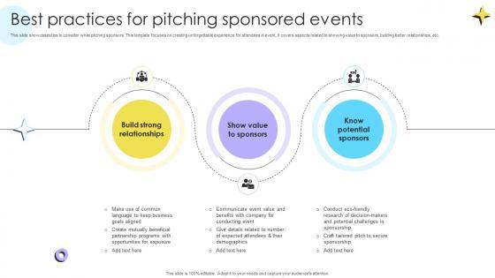 This slide showcases tips to consider while pitching sponsors. This template focuses on creating unforgettable experience for attendees in event. It covers aspects related to showing value to sponsors, building better relationships, etc. Boost your pitch with our creative Best Practices For Pitching Sponsored Events Encouraging Repetitive Customer Purchase Ppt Presentation. Deliver an awe-inspiring pitch that will mesmerize everyone. Using these presentation templates you will surely catch everyones attention. You can browse the ppts collection on our website. We have researchers who are experts at creating the right content for the templates. So you do not have to invest time in any additional work. Just grab the template now and use them. This slide showcases tips to consider while pitching sponsors. This template focuses on creating unforgettable experience for attendees in event. It covers aspects related to showing value to sponsors, building better relationships, etc.