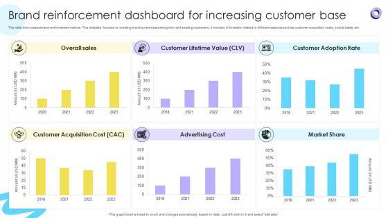 This slide showcases brand reinforcement metrics. This template focuses on creating brand awareness among new and existing customers. It includes information related to different aspects such as customer acquisition costs, overall sales, etc. Slidegeeks is one of the best resources for PowerPoint templates. You can download easily and regulate Brand Reinforcement Dashboard For Increasing Encouraging Repetitive Customer Purchase Ppt Presentation for your personal presentations from our wonderful collection. A few clicks is all it takes to discover and get the most relevant and appropriate templates. Use our Templates to add a unique zing and appeal to your presentation and meetings. All the slides are easy to edit and you can use them even for advertisement purposes. This slide showcases brand reinforcement metrics. This template focuses on creating brand awareness among new and existing customers. It includes information related to different aspects such as customer acquisition costs, overall sales, etc.
