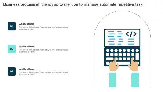 Showcasing this set of slides titled Business Process Efficiency Software Icon To Manage Automate Repetitive Task Slides Pdf The topics addressed in these templates are Business Process, Efficiency Software, Repetitive Task All the content presented in this PPT design is completely editable. Download it and make adjustments in color, background, font etc. as per your unique business setting. Our Business Process Efficiency Software Icon To Manage Automate Repetitive Task Slides Pdf are topically designed to provide an attractive backdrop to any subject. Use them to look like a presentation pro.