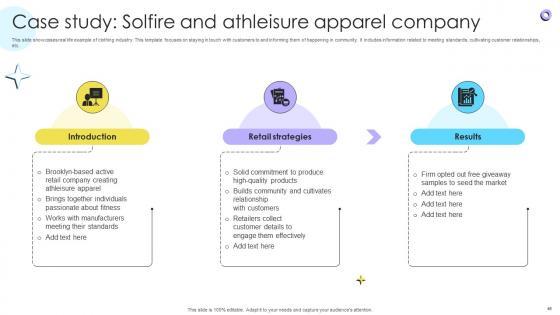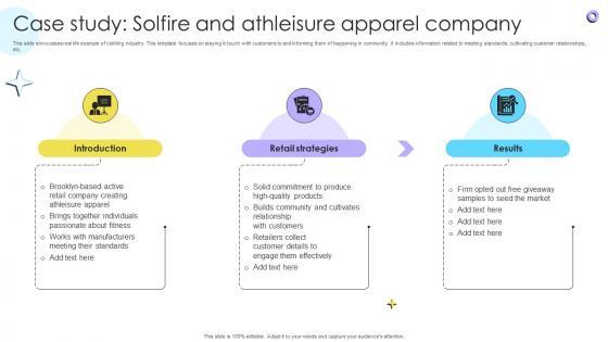 This slide showcases real life example of clothing industry. This template focuses on staying in touch with customers to and informing them of happening in community. It includes information related to meeting standards, cultivating customer relationships, etc. Do you have to make sure that everyone on your team knows about any specific topic I yes, then you should give Case Study Solfire And Athleisure Apparel Company Encouraging Repetitive Customer Purchase Ppt Slide a try. Our experts have put a lot of knowledge and effort into creating this impeccable Case Study Solfire And Athleisure Apparel Company Encouraging Repetitive Customer Purchase Ppt Slide. You can use this template for your upcoming presentations, as the slides are perfect to represent even the tiniest detail. You can download these templates from the Slidegeeks website and these are easy to edit. So grab these today This slide showcases real life example of clothing industry. This template focuses on staying in touch with customers to and informing them of happening in community. It includes information related to meeting standards, cultivating customer relationships, etc.