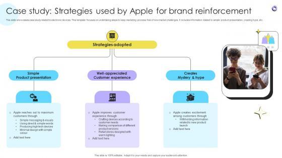 This slide showcases case study related to electronic devices. This template focuses on undertaking steps to keep marketing process free of new market challenges. It includes information related to simple product presentation, creating hype, etc. Get a simple yet stunning designed Case Study Strategies Used By Apple For Brand Encouraging Repetitive Customer Purchase Ppt Example. It is the best one to establish the tone in your meetings. It is an excellent way to make your presentations highly effective. So, download this PPT today from Slidegeeks and see the positive impacts. Our easy-to-edit Case Study Strategies Used By Apple For Brand Encouraging Repetitive Customer Purchase Ppt Example can be your go-to option for all upcoming conferences and meetings. So, what are you waiting for Grab this template today. This slide showcases case study related to electronic devices. This template focuses on undertaking steps to keep marketing process free of new market challenges. It includes information related to simple product presentation, creating hype, etc.