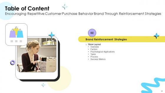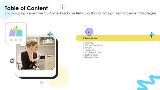 This Table Of Content For Encouraging Repetitive Customer Purchase Behavior Brand Through Reinforcement Strategies from Slidegeeks makes it easy to present information on your topic with precision. It provides customization options, so you can make changes to the colors, design, graphics, or any other component to create a unique layout. It is also available for immediate download, so you can begin using it right away. Slidegeeks has done good research to ensure that you have everything you need to make your presentation stand out. Make a name out there for a brilliant performance. Our Table Of Content For Encouraging Repetitive Customer Purchase Behavior Brand Through Reinforcement Strategies are topically designed to provide an attractive backdrop to any subject. Use them to look like a presentation pro.