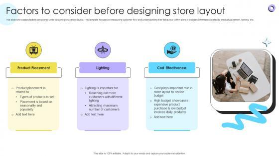 This slide showcases factors considered when designing retail store layout. This template focuses on measuring customer flow and understanding their behaviour within store. It includes information related to product placement, lighting, etc. Whether you have daily or monthly meetings, a brilliant presentation is necessary. Factors To Consider Before Designing Store Encouraging Repetitive Customer Purchase Ppt Example can be your best option for delivering a presentation. Represent everything in detail using Factors To Consider Before Designing Store Encouraging Repetitive Customer Purchase Ppt Example and make yourself stand out in meetings. The template is versatile and follows a structure that will cater to your requirements. All the templates prepared by Slidegeeks are easy to download and edit. Our research experts have taken care of the corporate themes as well. So, give it a try and see the results. This slide showcases factors considered when designing retail store layout. This template focuses on measuring customer flow and understanding their behaviour within store. It includes information related to product placement, lighting, etc.