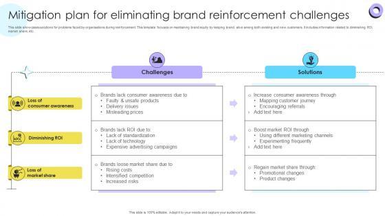 This slide showcases solutions for problems faced by organisations during reinforcement. This template focuses on maintaining brand equity by keeping brand alive among both existing and new customers. It includes information related to diminishing ROI, market share, etc. Formulating a presentation can take up a lot of effort and time, so the content and message should always be the primary focus. The visuals of the PowerPoint can enhance the presenters message, so our Mitigation Plan For Eliminating Brand Encouraging Repetitive Customer Purchase Ppt Example was created to help save time. Instead of worrying about the design, the presenter can concentrate on the message while our designers work on creating the ideal templates for whatever situation is needed. Slidegeeks has experts for everything from amazing designs to valuable content, we have put everything into Mitigation Plan For Eliminating Brand Encouraging Repetitive Customer Purchase Ppt Example This slide showcases solutions for problems faced by organisations during reinforcement. This template focuses on maintaining brand equity by keeping brand alive among both existing and new customers. It includes information related to diminishing ROI, market share, etc.