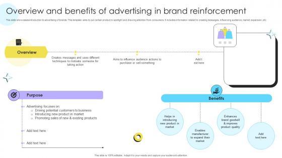 This slide showcases introduction to advertising of brands. This template aims to put certain product in spotlight and drawing attention from consumers. It includes information related to creating messages, influencing audience, market expansion, etc. This modern and well-arranged Overview And Benefits Of Advertising In Brand Encouraging Repetitive Customer Purchase Ppt Slide provides lots of creative possibilities. It is very simple to customize and edit with the Powerpoint Software. Just drag and drop your pictures into the shapes. All facets of this template can be edited with Powerpoint, no extra software is necessary. Add your own material, put your images in the places assigned for them, adjust the colors, and then you can show your slides to the world, with an animated slide included. This slide showcases introduction to advertising of brands. This template aims to put certain product in spotlight and drawing attention from consumers. It includes information related to creating messages, influencing audience, market expansion, etc.