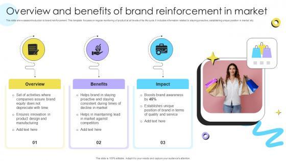 This slide showcases introduction to brand reinforcement. This template focuses on regular monitoring of product at all levels of its life cycle. It includes information related to staying proactive, establishing unique position in market etc. This Overview And Benefits Of Brand Reinforcement Encouraging Repetitive Customer Purchase Ppt Sample is perfect for any presentation, be it in front of clients or colleagues. It is a versatile and stylish solution for organizing your meetings. The Overview And Benefits Of Brand Reinforcement Encouraging Repetitive Customer Purchase Ppt Sample features a modern design for your presentation meetings. The adjustable and customizable slides provide unlimited possibilities for acing up your presentation. Slidegeeks has done all the homework before launching the product for you. So, do not wait, grab the presentation templates today This slide showcases introduction to brand reinforcement. This template focuses on regular monitoring of product at all levels of its life cycle. It includes information related to staying proactive, establishing unique position in market etc.