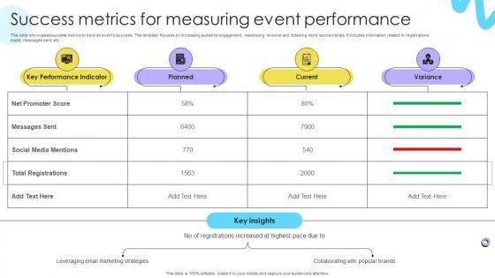 This slide showcases success metrics to track an events success. This template focuses on increasing audience engagement, maximizing revenue and obtaining more sponsorships. It includes information related to registrations made, messages sent, etc. Slidegeeks has constructed Success Metrics For Measuring Event Encouraging Repetitive Customer Purchase Ppt Presentation after conducting extensive research and examination. These presentation templates are constantly being generated and modified based on user preferences and critiques from editors. Here, you will find the most attractive templates for a range of purposes while taking into account ratings and remarks from users regarding the content. This is an excellent jumping-off point to explore our content and will give new users an insight into our top-notch PowerPoint Templates. This slide showcases success metrics to track an events success. This template focuses on increasing audience engagement, maximizing revenue and obtaining more sponsorships. It includes information related to registrations made, messages sent, etc.