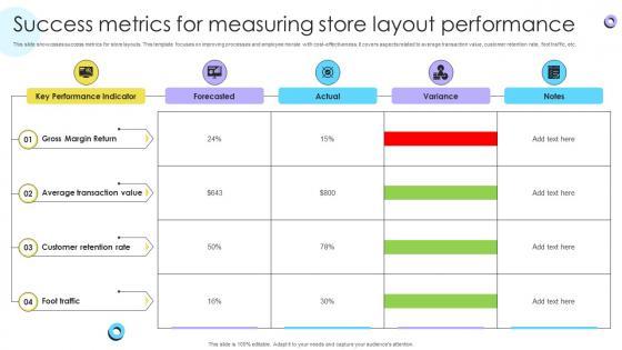 This slide showcases success metrics for store layouts. This template focuses on improving processes and employee morale with cost-effectiveness. It covers aspects related to average transaction value, customer retention rate, foot traffic, etc. Presenting this PowerPoint presentation, titled Success Metrics For Measuring Store Layout Encouraging Repetitive Customer Purchase Ppt Presentation, with topics curated by our researchers after extensive research. This editable presentation is available for immediate download and provides attractive features when used. Download now and captivate your audience. Presenting this Success Metrics For Measuring Store Layout Encouraging Repetitive Customer Purchase Ppt Presentation. Our researchers have carefully researched and created these slides with all aspects taken into consideration. This is a completely customizable Success Metrics For Measuring Store Layout Encouraging Repetitive Customer Purchase Ppt Presentation that is available for immediate downloading. Download now and make an impact on your audience. Highlight the attractive features available with our PPTs. This slide showcases success metrics for store layouts. This template focuses on improving processes and employee morale with cost-effectiveness. It covers aspects related to average transaction value, customer retention rate, foot traffic, etc.