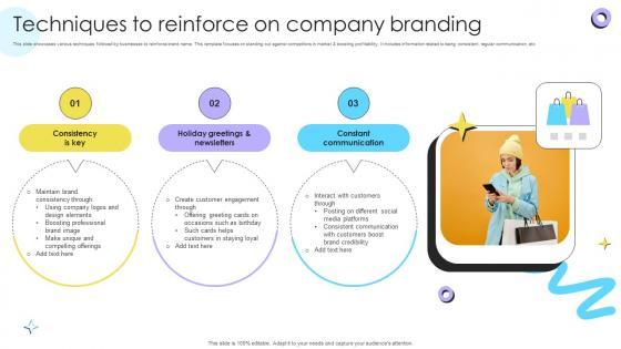 This slide showcases various techniques followed by businesses to reinforce brand name. This template focuses on standing out against competitors in market and boosting profitability. It includes information related to being consistent, regular communication, etc. Take your projects to the next level with our ultimate collection of Techniques To Reinforce On Company Branding Encouraging Repetitive Customer Purchase Ppt Powerpoint. Slidegeeks has designed a range of layouts that are perfect for representing task or activity duration, keeping track of all your deadlines at a glance. Tailor these designs to your exact needs and give them a truly corporate look with your own brand colors they will make your projects stand out from the rest This slide showcases various techniques followed by businesses to reinforce brand name. This template focuses on standing out against competitors in market and boosting profitability. It includes information related to being consistent, regular communication, etc