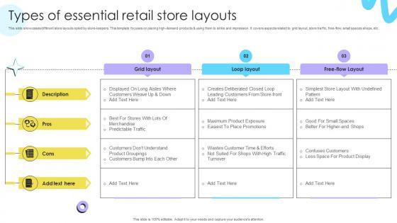 This slide showcases different store layouts opted by store-keepers. This template focuses on placing high-demand products and using them to strike and impression. It covers aspects related to grid layout, store traffic, free-flow, small spaces shops, etc. Are you in need of a template that can accommodate all of your creative concepts This one is crafted professionally and can be altered to fit any style. Use it with Google Slides or PowerPoint. Include striking photographs, symbols, depictions, and other visuals. Fill, move around, or remove text boxes as desired. Test out color palettes and font mixtures. Edit and save your work, or work with colleagues. Download Types Of Essential Retail Store Layouts Encouraging Repetitive Customer Purchase Ppt Sample and observe how to make your presentation outstanding. Give an impeccable presentation to your group and make your presentation unforgettable. This slide showcases different store layouts opted by store-keepers. This template focuses on placing high-demand products and using them to strike and impression. It covers aspects related to grid layout, store traffic, free-flow, small spaces shops, etc.