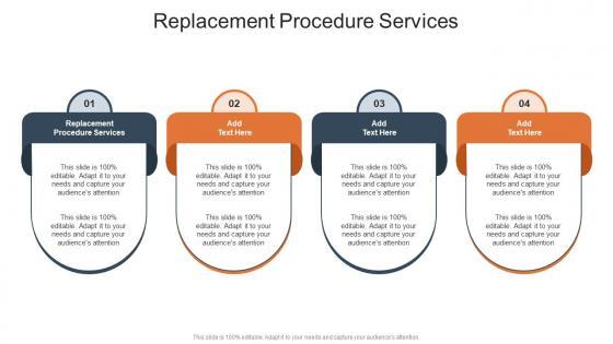 Introducing our well designed Replacement Procedure Services In Powerpoint And Google Slides Cpb This PowerPoint design presents information on topics like Replacement Procedure Services As it is predesigned it helps boost your confidence level. It also makes you a better presenter because of its high quality content and graphics. This PPT layout can be downloaded and used in different formats like PDF, PNG, and JPG. Not only this, it is available in both Standard Screen and Widescreen aspect ratios for your convenience. Therefore, click on the download button now to persuade and impress your audience. Our Replacement Procedure Services In Powerpoint And Google Slides Cpb are topically designed to provide an attractive backdrop to any subject. Use them to look like a presentation pro.