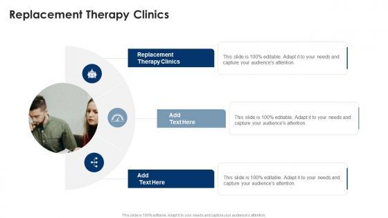 Presenting our innovatively designed set of slides titled Replacement Therapy Clinics In Powerpoint And Google Slides Cpb This completely editable PowerPoint graphic exhibits Replacement Therapy Clinics that will help you convey the message impactfully. It can be accessed with Google Slides and is available in both standard screen and widescreen aspect ratios. Apart from this, you can download this well structured PowerPoint template design in different formats like PDF, JPG, and PNG. So, click the download button now to gain full access to this PPT design. Our Replacement Therapy Clinics In Powerpoint And Google Slides Cpb are topically designed to provide an attractive backdrop to any subject. Use them to look like a presentation pro.