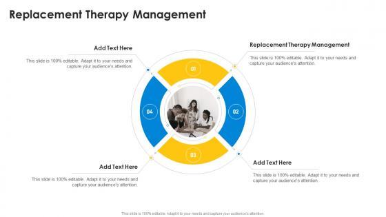 Introducing our well-designed Replacement Therapy Management In Powerpoint And Google Slides Cpb. This PowerPoint design presents information on topics like Replacement Therapy Management. As it is predesigned it helps boost your confidence level. It also makes you a better presenter because of its high-quality content and graphics. This PPT layout can be downloaded and used in different formats like PDF, PNG, and JPG. Not only this, it is available in both Standard Screen and Widescreen aspect ratios for your convenience. Therefore, click on the download button now to persuade and impress your audience. Our Replacement Therapy Management In Powerpoint And Google Slides Cpb are topically designed to provide an attractive backdrop to any subject. Use them to look like a presentation pro.