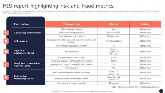 The following slide depicts management information system MIS report highlighting risk and fraud metrics. It provides information about regulatory environment, risk analysis, high risk customers, suspicious transaction reporting STR, transaction monitoring alerts, etc. The Integrating AML And Transaction Mis Report Highlighting Risk And Fraud Metrics Professional PDF is a compilation of the most recent design trends as a series of slides. It is suitable for any subject or industry presentation, containing attractive visuals and photo spots for businesses to clearly express their messages. This template contains a variety of slides for the user to input data, such as structures to contrast two elements, bullet points, and slides for written information. Slidegeeks is prepared to create an impression.