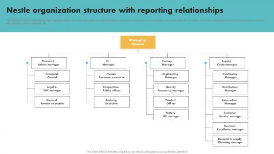 This slide provides glimpse about organization structure of Nestle corporation to understand the formal system of authority, communication, and roles within the company. It includes managing director, finance and admin manager, HR manager, factory manager, etc. Do you know about Slidesgeeks Nestle Organization Structure With Reporting Relationships Customer Segmentation Brochure Pdf These are perfect for delivering any kind od presentation. Using it, create PowerPoint presentations that communicate your ideas and engage audiences. Save time and effort by using our pre-designed presentation templates that are perfect for a wide range of topic. Our vast selection of designs covers a range of styles, from creative to business, and are all highly customizable and easy to edit. Download as a PowerPoint template or use them as Google Slides themes. This slide provides glimpse about organization structure of Nestle corporation to understand the formal system of authority, communication, and roles within the company. It includes managing director, finance and admin manager, HR manager, factory manager, etc.