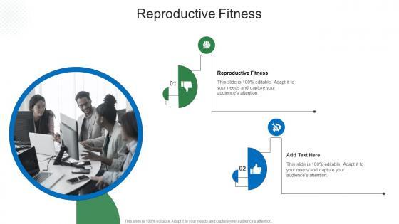 Introducing our well designed Reproductive Fitness In Powerpoint And Google Slides Cpb. This PowerPoint design presents information on topics like Reproductive Fitness. As it is predesigned it helps boost your confidence level. It also makes you a better presenter because of its high-quality content and graphics. This PPT layout can be downloaded and used in different formats like PDF, PNG, and JPG. Not only this, it is available in both Standard Screen and Widescreen aspect ratios for your convenience. Therefore, click on the download button now to persuade and impress your audience. Our Reproductive Fitness In Powerpoint And Google Slides Cpb are topically designed to provide an attractive backdrop to any subject. Use them to look like a presentation pro.