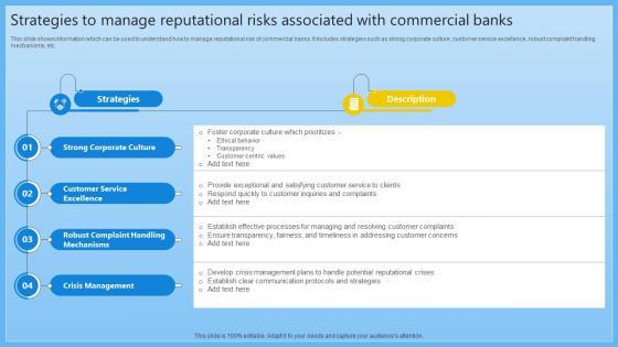 This slide shows information which can be used to understand how to manage reputational risk of commercial banks. It includes strategies such as strong corporate culture, customer service excellence, robust complaint handling mechanisms, etc. Presenting this PowerPoint presentation, titled Strategies To Manage Reputational Risks Associated Complete Guide On Managing Banking Fin SS V, with topics curated by our researchers after extensive research. This editable presentation is available for immediate download and provides attractive features when used. Download now and captivate your audience. Presenting this Strategies To Manage Reputational Risks Associated Complete Guide On Managing Banking Fin SS V. Our researchers have carefully researched and created these slides with all aspects taken into consideration. This is a completely customizable Strategies To Manage Reputational Risks Associated Complete Guide On Managing Banking Fin SS V that is available for immediate downloading. Download now and make an impact on your audience. Highlight the attractive features available with our PPTs. This slide shows information which can be used to understand how to manage reputational risk of commercial banks. It includes strategies such as strong corporate culture, customer service excellence, robust complaint handling mechanisms, etc.