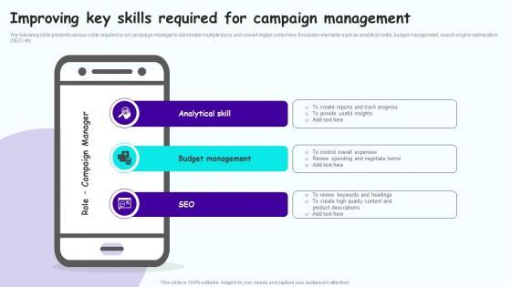 The following slide presents various skills required by ad campaign manager to administer multiple tasks and convert digital customers. It includes elements such as analytical skills, budget management, search engine optimization SEO etc. Get a simple yet stunning designed Mobile Promotion Strategic Guide For Micro Businesses Improving Key Skills Required For Campaign Download PDF. It is the best one to establish the tone in your meetings. It is an excellent way to make your presentations highly effective. So, download this PPT today from Slidegeeks and see the positive impacts. Our easy to edit Mobile Promotion Strategic Guide For Micro Businesses Improving Key Skills Required For Campaign Download PDF can be your go to option for all upcoming conferences and meetings. So, what are you waiting for Grab this template today.