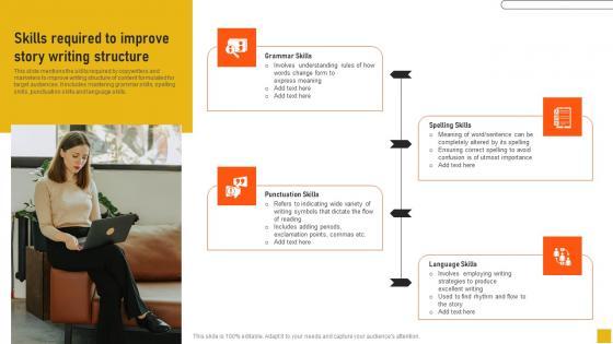 This slide mentions the skills required by copywriters and marketers to improve writing structure of content formulated for target audiences. It includes mastering grammar skills, spelling skills, punctuation skills and language skills. Are you in need of a template that can accommodate all of your creative concepts This one is crafted professionally and can be altered to fit any style. Use it with Google Slides or PowerPoint. Include striking photographs, symbols, depictions, and other visuals. Fill, move around, or remove text boxes as desired. Test out color palettes and font mixtures. Edit and save your work, or work with colleagues. Download Skills Required To Improve Story Writing Structure Comprehensive Guide Topics Pdf and observe how to make your presentation outstanding. Give an impeccable presentation to your group and make your presentation unforgettable. This slide mentions the skills required by copywriters and marketers to improve writing structure of content formulated for target audiences. It includes mastering grammar skills, spelling skills, punctuation skills and language skills.